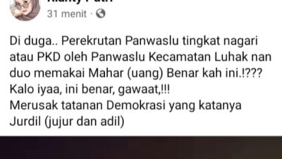 “Di duga…Perekrutan panwaslu tingkat nagari atau PKD oleh Panwaslu Kecamatan Luhak Nan Duo memakai mahar (uang) benarkah ini.!??? Kalau iya. ini benar, gawat,!!! Merusak tatanan demokrasi yang katanya jurdil (jujur dan adil),” ulas akun Facebook Rianty Putri.