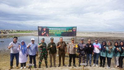 Pasaman Barat, WahanaInvestigasi.com Bertemakan TNI Bersama Rakyat Bersatu Dengan Alam Untuk NKRI, Kodim 0305/Pasaman bersama Wakil Bupati Pasaman Barat (Pasbar) Risnawanto dan Unsur Forkopimda melakukan penanaman 340 Pohon Mangrove yang dipusatkan di Pantai Muaro Tanjung Pohon Seribu Sasak Kecamatan Sasak Ranah Pasisie, Rabu (21/2).